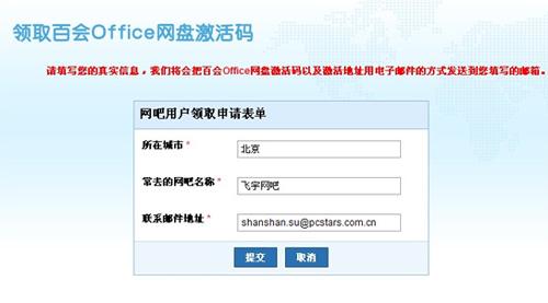 点击进入,按照提示输入所在地、常去的网吧名称、联系邮箱地址提交后,剩下的工作就是等待百会客服人员将激活码发送到所填写的联系邮箱地址。这里需要提醒,填写的邮箱地址一定要正确,不然就无法正常的接收到百会Office 5G网盘激活码了。
