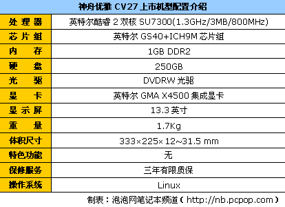 编辑点评:神舟优雅CV27搭载英特尔酷睿2双核SU7300处理器、1GB内存、250GB硬盘、13.3英寸液晶显示屏,神舟今天对该产品进行了降价,非常划算。