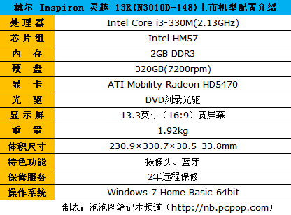 戴尔 Inspiron 灵越 13R(N3010D-148)配备了Intel Core i3-330M处理器(2.13GHz主频)、Intel HM57芯片组、标配2GB DDR3内存、7200转320GB硬盘、DVD刻录光驱和ATI Mobility Radeon HD 5470独立显卡。目前,该机型售价为5999元。