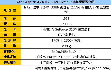 AcerAspire 4741G-332G32Mn笔记本采用Intel酷睿i3双核 330M处理器(2.13GHz主频/3MB三级缓存)、2GB内存、320GB硬盘、NVIDIA GeForce 310M独立显卡以及分辨率为1366×768的14英寸显示屏。