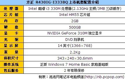 方正R430IG-I333BQ笔记本采用Intel酷睿i3330M处理器(2.13GHz主频/3MB三级缓存)、IntelHM55芯片组、2GB内存、500GB硬盘、NVIDIA GeForce 310M独立显卡以及分辨率为1366×768的14英寸显示屏。