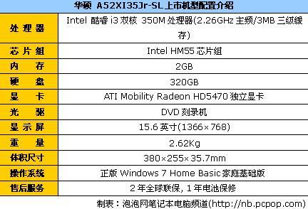 华硕A52XI35Jr-SL笔记本采用Intel酷睿i3双核 350M处理器(2.26GHz主频/3MB三级缓存)、IntelHM55芯片组、2GB内存、320GB硬盘、ATI Mobility Radeon HD5470独立显卡以及分辨率为1366×768的15.6英寸显示屏。