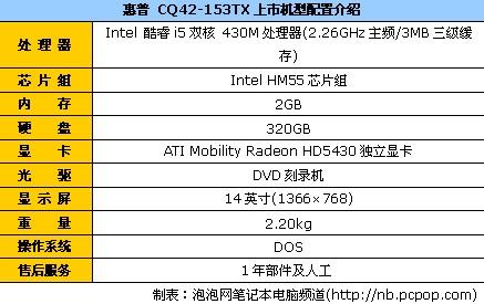 惠普CQ42-153TX笔记本采用Intel酷睿i5双核 430M处理器(2.26GHz主频/3MB三级缓存)、IntelHM55芯片组、2G内存、320G硬盘、ATI Mobility Radeon HD5430独立显卡以及分辨率为1366×768的14英寸显示屏。