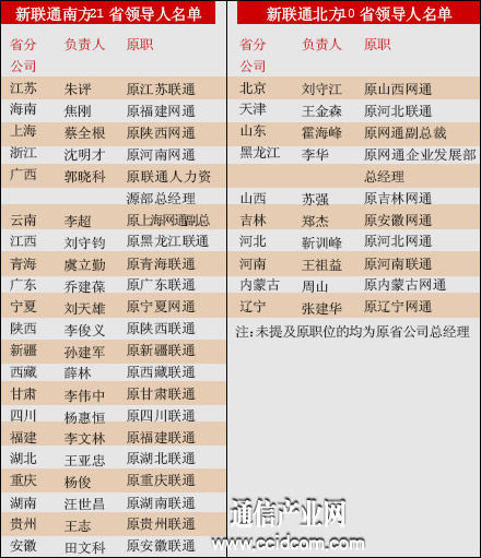 随着新联通省、市、县级组织架构的确定,各省市相关领导已经确定,如原山西网通的总经理刘守江为新联通北京市分公司负责人,而原湖北联通总经理王亚忠则仍留任新联通湖北分公司负责人(详见上表)。据了解,在新联通省分公司的负责人中,原联通与原网通的高管比例基本上为1:1,坚持均衡原则。这也印证了此前中国联通董事长常小兵的观点,在新联通内部机构设置和负责人安排的工作上,主要遵循适应发展需要、确保平稳过渡、兼顾当前及今后、合理均衡配备等四项原则。“在主要负责人的安排上,注重了原中国网通和原中国联通干部的总体均衡。”常小兵说。