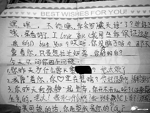 中学生,甚至是小学生的“早恋”已不是什么值得大惊小怪的事情了,然而在看了网友“typhooncome”于日前发出的“雷死人的六年级小学生的字条”一帖中,几张两个六年级小学生互相“传递爱语”的字条后,记者还是着实被雷了一把,其中的内容和用词就如发帖者所说的一样“非常非常雷人”。