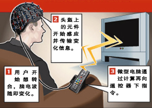 据悉,这是世界上首次将人的思维转化为动力并应用于电视遥控上。首先,科学家将一个布满无数个可以感应人脑电波的电子原件制成的“帽子”安在测试者头上,当测试者的脑电波发生变化时,电子元件会通过光纤将变化传递到微型电脑上。之后,微型电脑会开始对获取的电波信息进行计算,从而“揣摩”出测试者的意愿并作出相应的指令:转台或是开关电视。在此之前,该公司的研究人员还曾经成功的让一名测试者通过电脑波控制一部电动火车模型的运动。