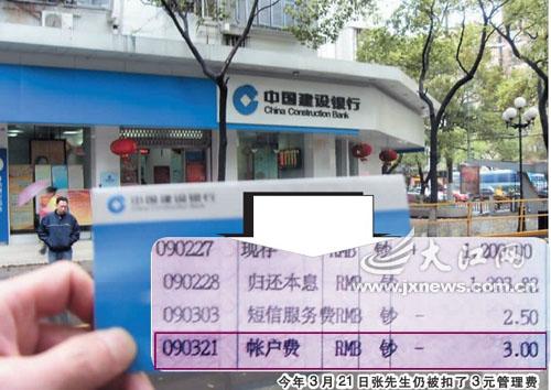 2006年4月,张先生向建行南昌洪都支行申请了房贷。银行为他单开了一个专门用于还房贷的账户。张先生说,该账户自使用起,每隔3个月会被扣掉3元的账户管理费,但直到今年2月,和朋友聊天才得知所谓的账户管理费实为小额账户管理费。