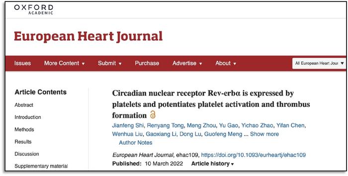 研究人员在临床研究中发现,人体血小板聚集和血栓形成具有晨峰现象。健康人体血小板中存在一种特殊的、呈现昼夜震荡的生物钟核受体,驱动了人类血小板聚集和血栓形成的晨峰现象。其在血栓形成中发挥关键作用。