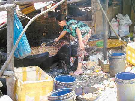 昨日上午,记者前往羊头镇村采访。在羊头镇村东头的垃圾堆旁,记者找到一片搭建十分凌乱的“养猪部落”。一名中年妇女正在猪圈旁炼制泔水油,一口落地大铁锅内漂浮着剩饭菜,脏腻油污,随着熊熊炉火,脏臭的泔水满锅沸腾,臭气熏天。