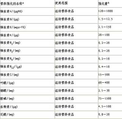 a:营养强化剂的来源使用《食品营养强化剂使用卫生标准》(GB14880-1994)批准的营养素来源。 b:强化量以运动员的每天营养素摄入量计。