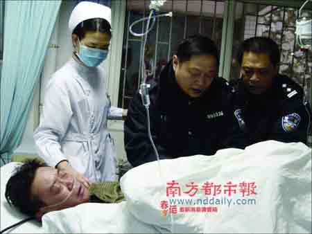 记者赶到广东省第二中医院,邹本固仍处在昏迷中,正在急救室。输氧、输液,将近一个小时后,邹本固终于睁开双眼。