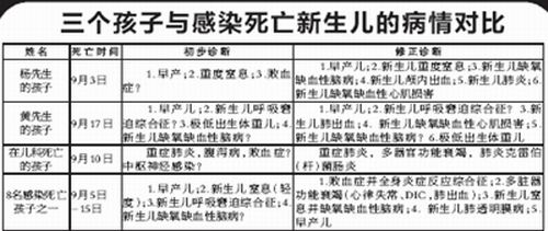 家属们认为,两位孩子死亡症状与公布的8名死亡患儿惊人地相似(见左表),医院感染问题应该不只是这11天,以这么具体的时间划分孩子的死因,显然违背科学精神。