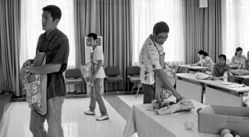 第一项体验内容是“呼吸法”,几名“孕妇”都做得挺认真,他们滑稽的样子,惹得正在学习孕产妇保健的其他10多个准爸爸们捧腹大笑。