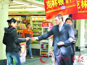 昨日,一位名叫“克林顿”的人在东莞街头给消费者免费派发其代言的安全套(见上图)。不过,这位“克林顿”可不是前美国总统比尔·克林顿,而叫威廉·比利·克林顿,加拿大人。对于商家的宣传手法,有市民质疑这是借美国前总统克林顿的名字来制造噱头。(记者 周伟涵 通讯员 黄菲 摄)
