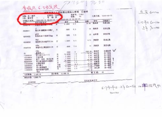 第一份清单是她母亲席桂芬的。席桂芬今年80岁,是南阳市商业局的离退休干部,多年来患有高血压、糖尿病、老年痴呆症等,近年来经常在南阳市第三人民医院住院治疗。清单显示的时间为“2007年10月29日至30日(前日零点至次日零点,下同)”,李冰特意在两行费用上用红笔作了标记:一次性用品,单价10元,套数258套,合计金额2580元,类别为其他费用。也就是说,在医疗费用之外,席桂芬这一天挥霍掉了258套一次性用品。第二份清单上,时间为:2008年6月14日,其母亲的性别变成了“男”。