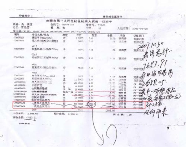 李冰拿着一厚厚一沓子住院清单说,每次住院时交100元押金后,病人即可使用医院提供的被褥、茶瓶等物品,此外连一圈卫生纸他们也没用过,根本不知道价值10元钱的一次性用品是什么,何况一天竟用了258套!李冰还用笔把下列她认为没有消费的项目作了标记:2007年11月8日,开蜂蜜5瓶,计费115元;奇正消痛贴10盒,计费142元;2008年1月6日,开山甲若干,费用552.50元;2007年11月8日陪护床位20张;2008年5月4日陪护床位15张。