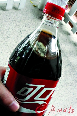 “8月4日我们又发现了一瓶疑似发霉的可乐,这次我们没有打开包装。”阿斌说。记者看到,这瓶1.25升的可口可乐饮料瓶里,深褐色的液体上漂浮着一块直径约3厘米、厚约2厘米的灰黑色毛絮状物,瓶盖未拧开,但有一点倾斜的痕迹,瓶盖上印着生产日期的编号标识:2009610151911,生产地是可口可乐惠州有限公司。