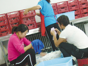记者被安排到包装车间。该车间门上写着“无菌车间”,然而,15日下午15时许到23时许,记者在此工作了8个小时,却无法将所见所闻与“无菌”联系起来——