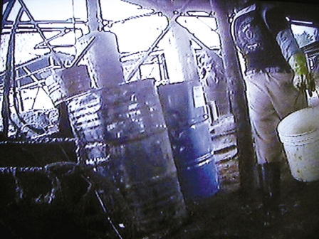 昨天下午,羊城晚报记者以收购“潲水油”为名,进入该家炼油窝点。从泰龙工业园附近的一条小路拐入,穿过铁路涵洞不到100米即到,门口以竹栅栏做门,未见厂名或挂任何招牌,却用木杆高高挂起一个油桶。人一走近门口,一阵难闻的馊臭味便迎面扑来,入门左侧堆放了几十个空油桶,还有一堆堆榨剩的油渣。场内中央并排连着十几个大水泥池,池内装填有大量剩饭剩菜等食品垃圾,空气里弥漫着恶臭,令人掩鼻;再往里走,是一架带有发动机的简陋榨油机,机器轰鸣声中,不断有深黄色的油液被挤出,滴到榨油机下方的一个槽里;旁边还有几个貌似用作煮油的圆筒装置,周围油污满地。记者现场看到,场内没有一间固定建筑,全是用木头、镁瓦搭建起来的粗陋临时棚寮。