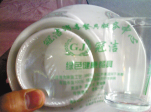 这两家产品一个名叫“冠洁”,一个名叫“天康”。饭店老板告诉记者,名为“冠洁”的餐具是最近才进入市场的,而名叫“天康”的餐具则已经有了一段时间。“冠洁餐具的老板是我们矿区卫生局长的丈夫,他亲自登门推销,我们也不敢说什么,只好用一些。”