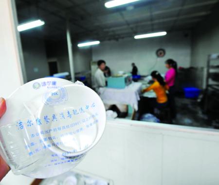 记者进入楼房看到,左侧是用木板隔出来的房间,分为清洗间和包装间,右边则是宿舍和食堂。餐具包装袋上印有“洁尔康餐具消毒配送中心”、“本产品经380℃以上热风消毒、无菌包装,敬请放心使用”等字样。但是,在实际操作过程中似乎和消毒及无菌包装挨不上边。