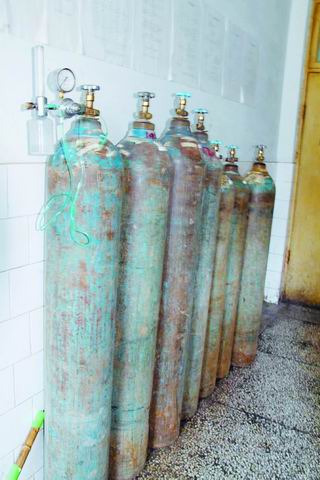 尉氏县一些群众向记者反映,尉氏县第二人民医院继续使用工业氧冒充医用氧。昨天上午,记者来到该院病房楼一楼内科住院部,在一个标注有抢救室的房间里,放着7个氧气钢瓶,没有医用氧气合格证、没有药品批准文号、没有生产日期,甚至钢瓶上没有氧气生产厂家的名字。有的钢瓶上的检验标志注明使用时间为2004年至2007年。一个钢瓶上还装着吸入器,病房内的患者告诉记者,患者吸的就是钢瓶内的氧气。