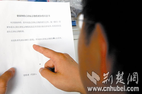 在武汉大学中南医院体检中心,健康体检不查乙肝,如果要查,则当事人必须签署“知情同意书”;在同济医院体检中心,记者发现“体检套餐表”上“乙肝全套定性(5项)”这条已被圆珠笔划去;慈铭体检武汉中心负责人则告诉记者,收到文件后该机构已经把乙肝项目从所有体检套餐中删除。