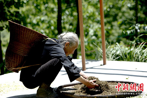 笔者早上7点赶到王婆婆家,而大门紧关着,王婆婆儿媳妇告诉我她已出门了,要笔者去她茶园找找看。清早去茶园的小路尽是杂草,找遍了她家茶园也没见人影,倒把我鞋子全透湿了。后得知老太太去后山采金银花去了,直到中午王婆婆背着一背篓金银花回来,中午气温足有30度,她没进屋忙将采摘的金银花散在屋前水泥道场上。她女儿讲,她娘就喜欢这大太阳,金银花几天就晒干了。