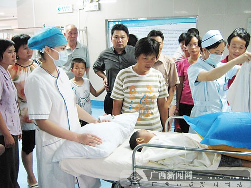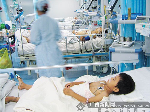 6月23日下午2时,记者赶到贵港市人民医院时,正遇见自治区卫生厅、教育厅的领导前来看望中毒的幼儿。在医院外科楼二楼的重症监护室内,5名幼儿正在接受救治,其中3名病情较重。一名看起来只有四五岁的小孩口鼻插着导管,躺在床上不停地抽搐。医生告诉记者,这名幼儿身体素质较差,被送到医院抢救后出现了血尿、高烧、肺水肿等症状,有病情加重的趋势。后来,经过抢救,病情得到缓解。
