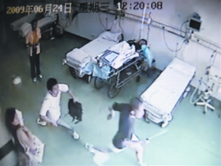 监控录像中显示:一名光头男子逃进抢救室,两名男子持刀一路追砍(见图),在抢救室一角将其砍成血人才罢休。行凶几分钟后,6名砍人凶徒从容走出医院,沿香江花园路口向三眼桥方向逃走。伤者随即被送进十一医院手术室,抢救后一人伤势严重被转往协和医院治疗。