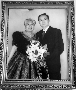 在房间的墙上贴满了张祥琯老人的书画作品、京剧剧照。据了解,张祥琯老人是吉林大学的退休干部,也是吉林大学书画协会的会长,还是京剧票友,屋里最耀眼的是墙上那幅老两口的金婚纪念照。