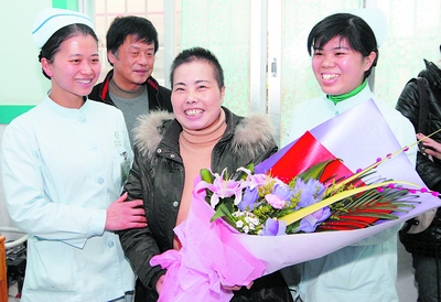 3月2日上午,已将一头长卷发剪成寸头的吴泽连由丈夫陪着坐在病床前的凳子上。此时的她满面笑容,脸上还带着一丝红润。入院66天来,在众多亲友都认为“没得救了”的情况下,她硬是从“鬼门关”被拉了回来。