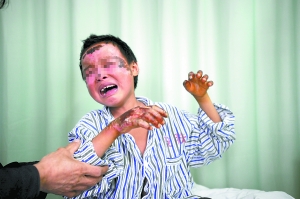 昨天下午,10岁男孩小圣闭眼躺在西南医院皮肤科病床上,双手被纱布包裹得严严实实。一张圆脸红红的,除了一些疤结,额头上一大片皮肤破损,如被烧伤了一样。半个多月前,他在放学回家路上晒了太阳,竟被阳光灼成深Ⅱ度烫伤,手部、脸部像被开水烫了一样。