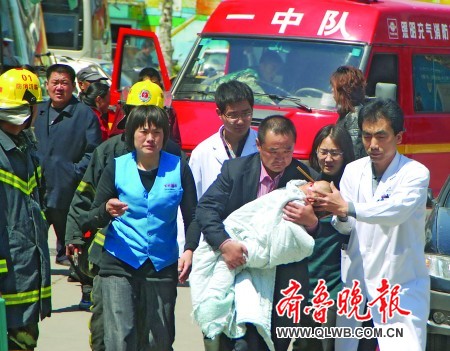 10:25,消防人员开动警车将小皓皓送往临沂市人民医院总院。五分钟后,小皓皓被爸爸抱到了临沂市人民医院总院的磁共振检查室。