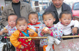 昨日上午,河南郑密路与淮河路交会处农贸市场门口,约一岁半的五胞胎绕着一辆小推车嬉笑打闹,吸引路人纷纷驻足。三男二女,名叫贝贝、晶晶、欢欢、迎迎和妮妮,与奥运吉祥物五福娃同名。