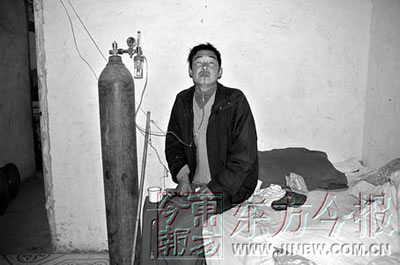 和记者聊了一会儿,吴乃学咳嗽了一阵子,他探起身,拄着竹竿往屋内走,记者不明白他干什么,跟了进去。原来,他的卧室床头前,放着一个大氧气瓶,他刚才感觉到了呼吸困难,进屋吸了几口氧气,脸上又是一阵通红。
