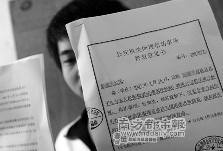 小东(纸后人)的父亲出示公安机关的答复意见书。