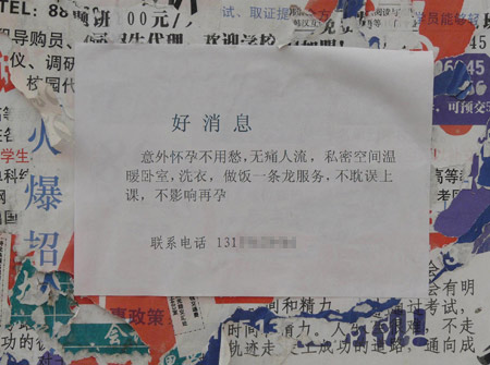 而记者在某高校内发现,校内的广告栏上竟有专为做过人流的女大学生服务的月嫂广告。