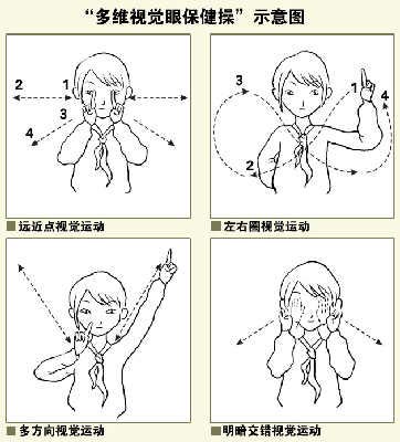据介绍,“多维视觉眼保健操”时长5分钟,分“远近点视觉运动”、“左右圆线视觉运动”、“多方向视觉运动”、“明暗交替视觉运动”4节。做操时,或双手食指竖起,向前后上下左右方向伸出,或单手在眼前画8字;眼睛始终盯着手指,随着手指运动调整目光。