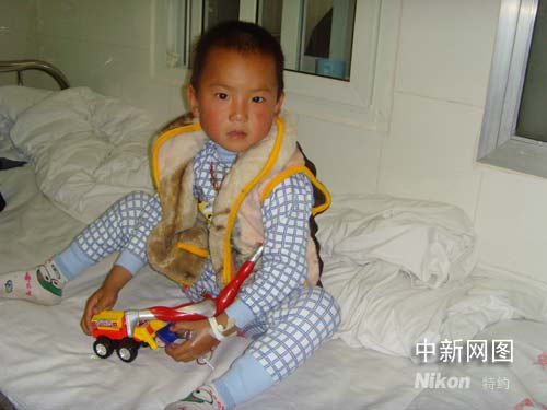 一名康复儿童在病床上高兴地玩着手中的汽车玩具。张杰 摄