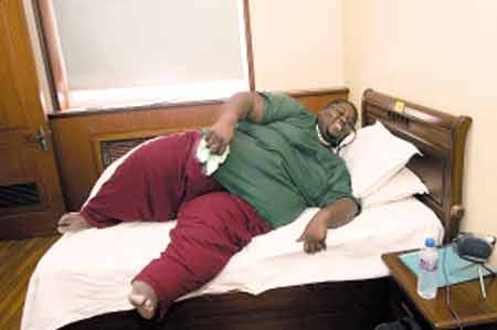 阿隆佐“老家”在美国芝加哥,与天津有13小时左右的时差,因此,他到津第一天就睡觉倒时差,睡醒后的第一件事就是称体重。他踩上体重计后,医生一连放了4个秤砣才测出他的重量——284.5公斤。在天津减肥生活的一年内,他计划将体重减至90公斤左右。