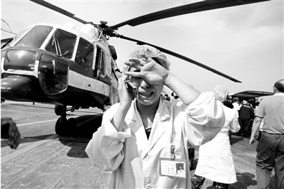 昨天下午4点05分,东方通用航空公司的一架米1-71直升机缓缓降落在广汉机场停机坪上。舱门打开,40岁的女护士杜娟下了飞机,招呼着成都120急救中心的医护人员将伤员抬到急救车上。杜娟是北川县禹里羌族乡卫生院的护士。5·12地震后,禹里与世隔绝,直到昨天才等到直升机将重伤者送出。杜娟随机照顾患者。伤员都下了飞机后,杜娟向于波借手机,电话打通时,她手开始颤抖,撕心裂肺的哭声终于无法忍住。那是她六天后,第一次给外面的亲人打电话。巨大的螺旋桨转动声中,人们只能依稀听到她的哭诉:“我要去找他,不能连个尸体都没有。”于波默默地看着她,不到一个小时前,他还觉得这个女护士严厉得有点过分。