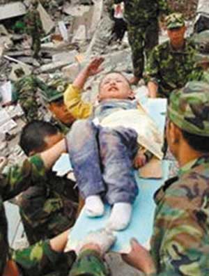 【当初】:在地震发生十余小时后,一位满脸是血的男孩终于被武警官兵从废墟中救出。男孩的左手骨折,一位战士用木板小心地夹住他的手臂,缠上了绷带,又慢慢地给男孩喂了一些矿泉水。把男孩放在一块蓝色的木板上后,武警官兵准备把他转移到安全地带,然而,就在这时,令人动容的一幕出现了:年幼的男孩艰难地举起尚能动弹的右手,虚弱而又标准地敬了一个少先队队礼。