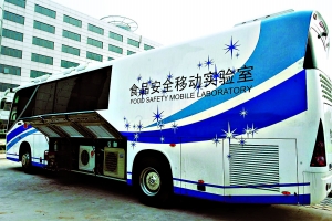 食品安全移动实验室,到底是个什么样子?单从外观来看,这就是一辆普普通通的12米长的大客车,只是客车外喷上了蓝色的“食品安全移动实验室”的字样。车厢里可是“麻雀虽小,五脏俱全”,摆放了各种精密仪器、试管、量杯……