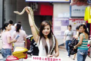 这名自称叫“优优”的年轻女子说,她今年22岁,陕西人,曾是专业舞蹈演员。她从小不怕蛇,3年前自己养起了蛇,刚开始由于缺乏专业养殖知识,死了好几条蛇,她为此十分难过。现在她对“蛇性”相当了解,还学起了蛇舞、印度舞、肚皮舞。优优指指脖子上的蛇称,这是条缅甸蟒,10多斤重,进食胃口很大,不仅要吃猪肉,而且一次能吃七八只和鸽子差不多大小的鸟。由于养蛇,这几年来优优一直单独一人居住,“没几个人不怕蛇的,我只能带着蛇单独过。”带蛇来“逛”山西路,优优另有目的,她背后的胡导称,他计划花5年时间搜集500个奇人,拍摄奇人喜剧电影,让他们展示各自绝技,目前有人愿出数百万拍摄。