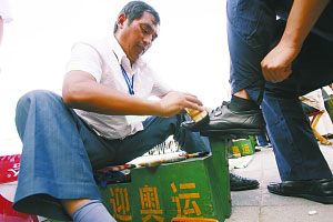 昨日下午,侯现中在水立方西门附近为游客免费擦鞋。本报记者 孙纯霞 摄