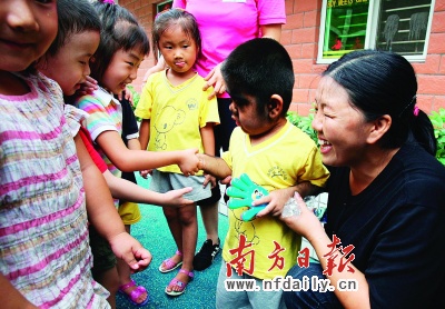 昨日早上10点多钟,“毛孩”穿上新校服、背上新书包,来到了梧桐山中英文幼儿园,他欢喜地玩起了滑滑梯。幼儿园的小朋友们给“毛孩”送来了画笔、玩具等礼物,还纷纷抢着和他握手以示欢迎。小班的马瑞说她很喜欢这个新同学。可小毛孩似乎并没有很快融入这个环境,只是开心地自己玩耍,跟小伙伴们交流很少。田亚华解释,因为“毛孩”之前在河源长时间处在一个比较与外界封闭的环境,因此突然进入新环境要有一个适应过程。“对毛孩的最高救助目标是,通过对他的教育,使他能够在某一个领域有所长,以此来消抵其体貌缺陷,让他到16岁之后,自己能够要求不脱毛,能够充满自信地正视自己的体貌特征,甚至认为‘全身长毛’就是他的标志。”田亚华说。