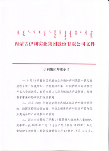 中新网9月17日电 伊利集团今日发表声明称,16日在接到国家质检总局通知伊利集团一款儿童奶粉含有三聚氰胺后,伊利集团在第一时间内将市场该批次产品已全部回收,目前市场上已没有该批次产品销售。同时为给消费者带来的影响深表歉意。
