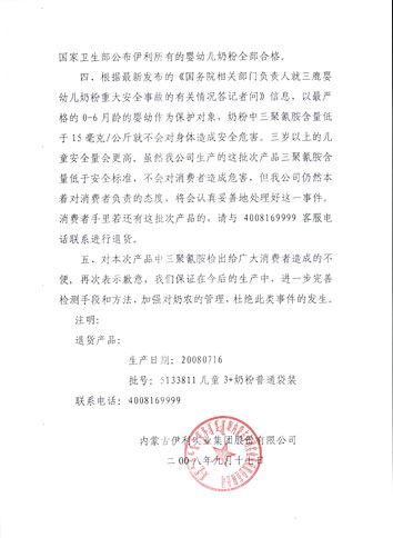 四、根据最新发布的《国务院相关部门负责人就三鹿婴幼儿奶粉重大安全事故的有关情况答记者问》信息,以最严格的0-6月龄的婴幼作为保护对象,奶粉中三聚氰胺含量低于15毫克/公斤就不会对身体造成安全危害。三岁以上的儿童安全量会更高。虽然我公司生产的这批次产品三聚氰胺含量低于安全标准,不会对消费者造成危害,但我公司仍然本着对消费者负责的态度,将会认真妥善地处理好这一事件。消费者手里若还有这批次产品的,请与4008169999客服电话联系进行退货。