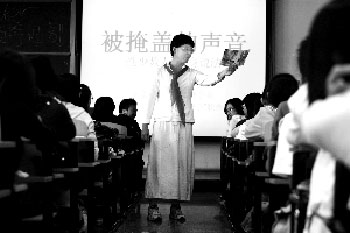 11日下午,易装恋者曹靖身着白裙向学生们“讲课”。本报记者 浦峰 摄
